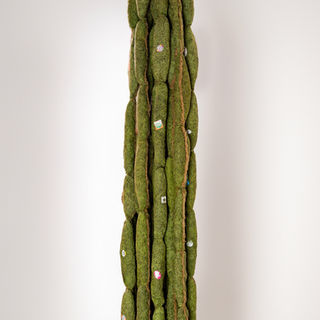 Bautista’s interest in re-appropriating nature, consists in creating new forms by blending organic debris, yute plant, mortero and mixed media materials with plastic. She wanted to show how the plastic which is used to make bags for carrying objects reveals consumerism and materialism to represent society’s way of living. Materials are important elements to adapt while configuring a new form. Installing those plastic materials in a new space can transform the space. Artificial barks become consumer products or polluted agents.